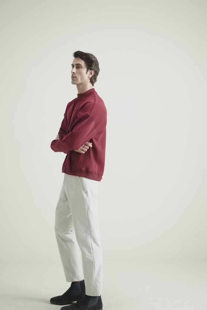 This burgundy interlock sweatshirt features a ribbed mock neck and sleeves, enhanced with tuck pleats running from the shoulder to wrist for an elevated touch. Designed for effortless layering, it’s the kind of piece you’ll want to pair with your favorite jacket for a refined yet relaxed look.