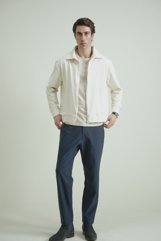 Perfect Off-White hue, this front-open zipper jacket offers a soft clean fabric with thermal properties, refined feel perfect for fall. Made for effortless layering, it combines comfort, timeless appeal, and versatile styling that transitions seamlessly from casual days to elevated evenings.