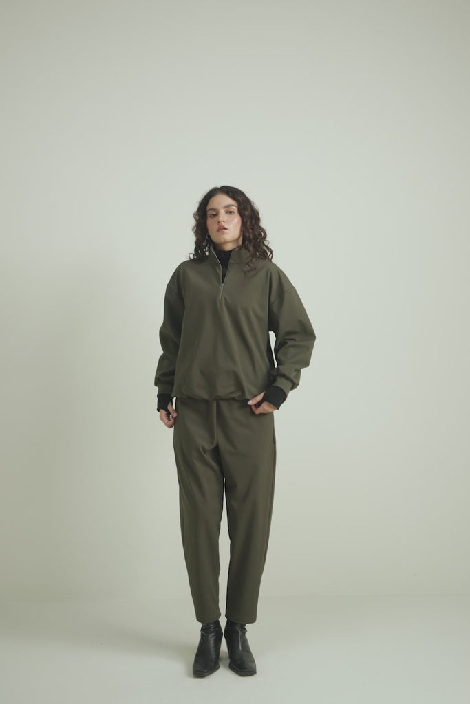 This 'Olive Knit Sweatshirt' is made from water-repellent fabric. It features a sleek mock neck with a front zipper closure, dropped shoulders, full-length sleeves and sleeve and bottom cuffs ensure a secure and comfortable finish. A versatile staple that blends performance and everyday ease.