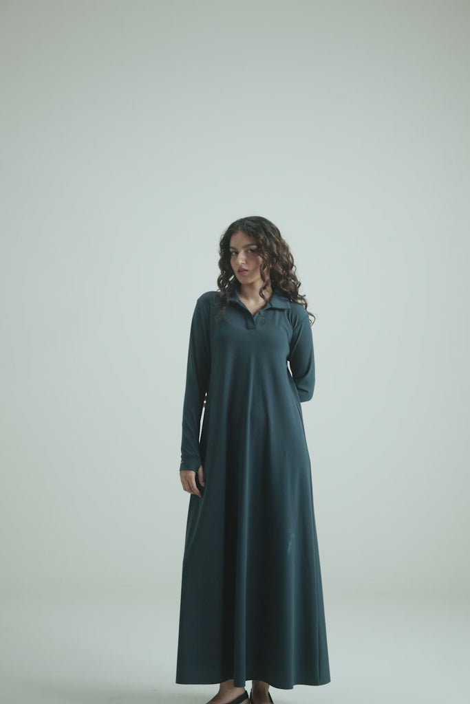 This 'Polo Knit Dress - Teal' dress made from soft textured thermal knit fabric in a rich teal hue. It features a one-piece collar, front half placket for a clean look and full-length sleeves with thumbhole detail for added comfort. The silhouette flows into a flared hem that adds subtle movement and femininity. Perfect for cool-weather layering with a modern, effortless appeal.